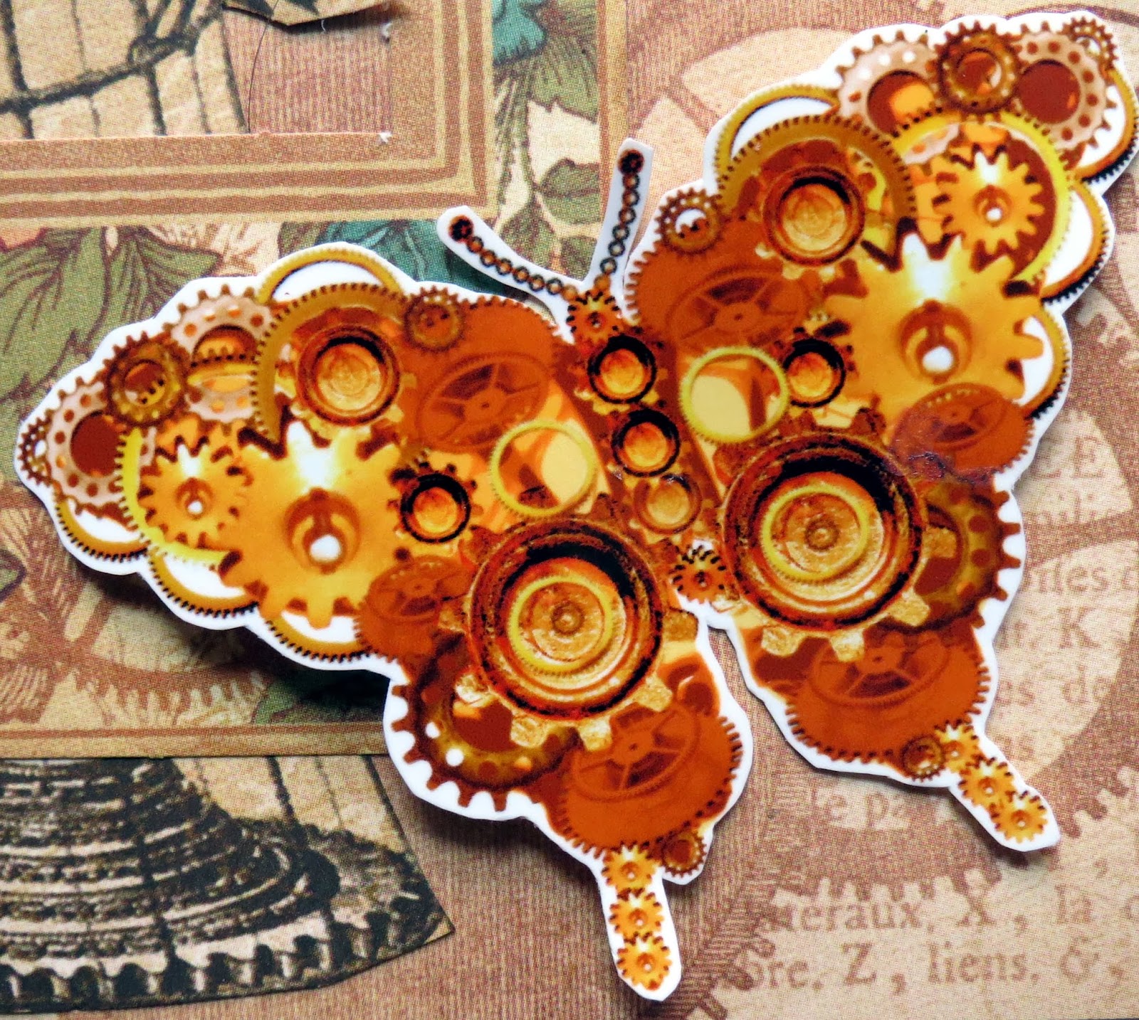 The white butterlies have been cut from a cupcake holder. I cut off the bottom of the "skirt" from the main image off the gorgeous Steampunk lady, then repositioned it so that it peeped from under the flowery frame.